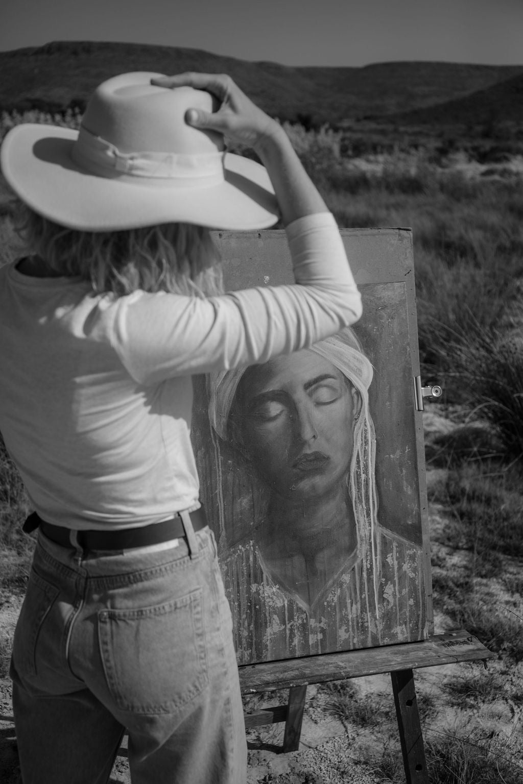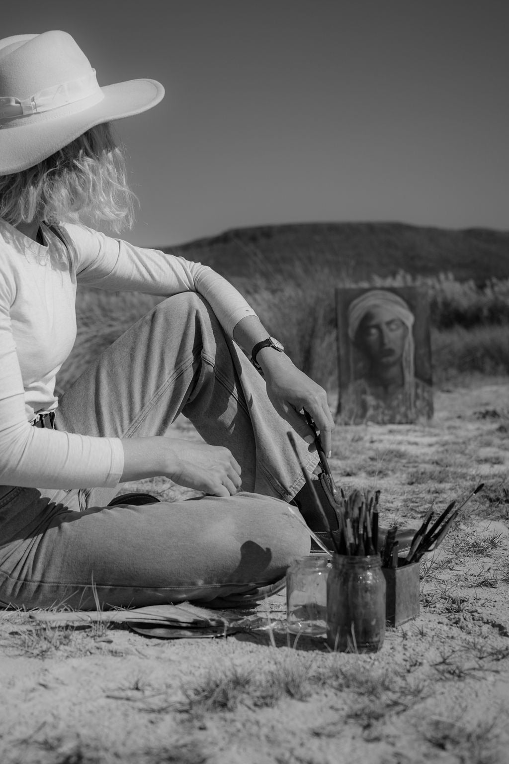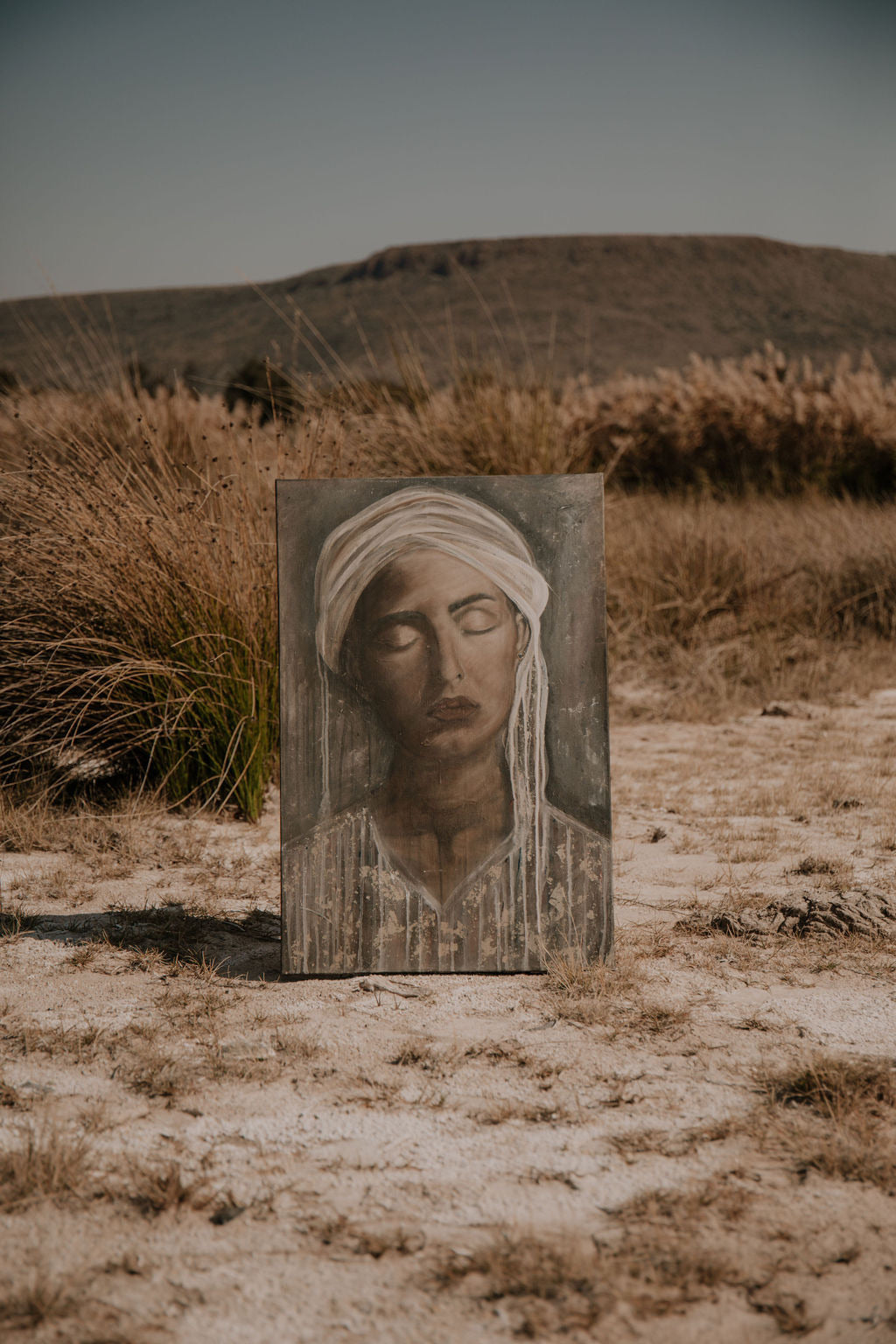 Sy is die enigste een van die ses gesigte met geslote oë. Sy begin in donkerte, swart en
