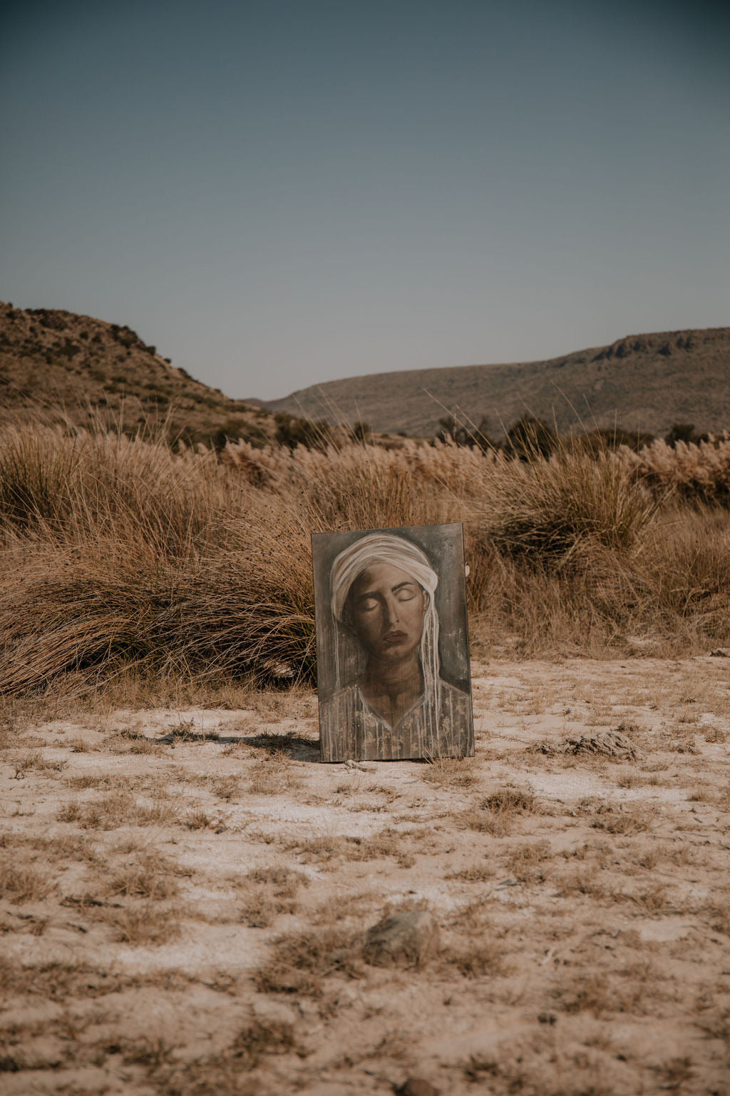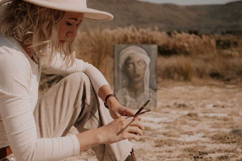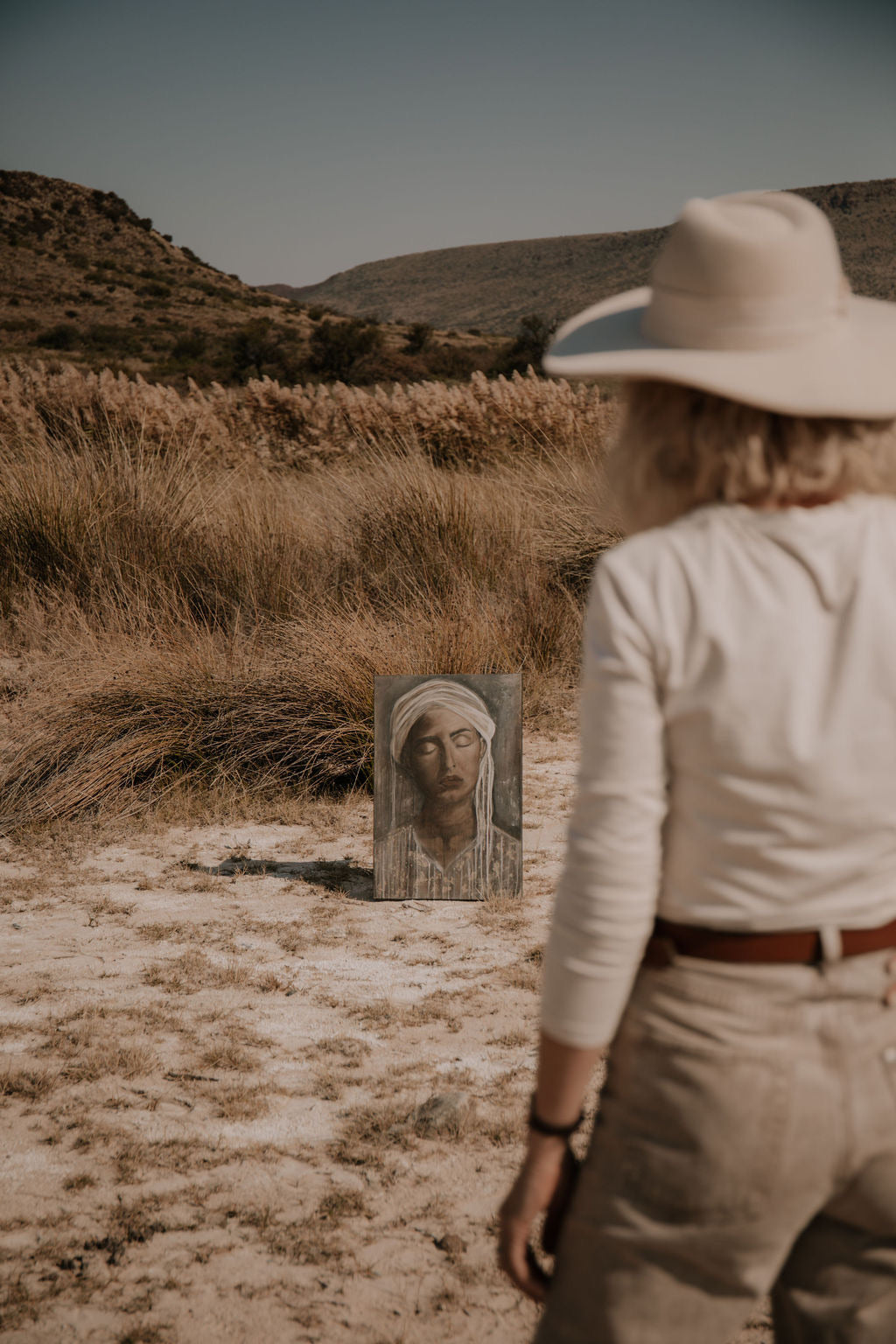 Sy is die enigste een van die ses gesigte met geslote oë. Sy begin in donkerte, swart en